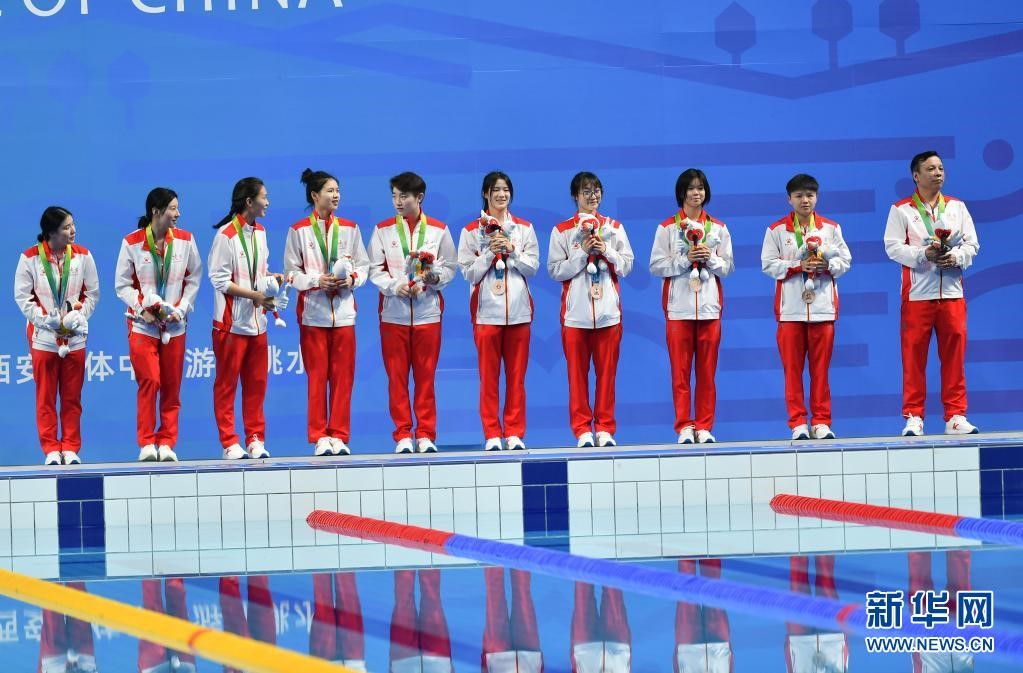 9月6日,第十四屆全運(yùn)會(huì)跳水女子團(tuán)體賽頒獎(jiǎng)儀式在西安舉行,季軍陜西隊(duì)在頒獎(jiǎng)儀式上。新華社記者張博文 攝