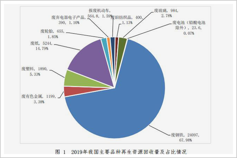 據(jù)商務(wù)部《中國再生資源回收行業(yè)發(fā)展報告(2020)》,我國可再生資源回收主要集中在廢鋼鐵、廢有色金屬、廢塑料、廢輪胎、廢紙、廢棄電器電子產(chǎn)品、報廢機(jī)動車、廢舊紡織品、廢玻璃、廢電池等領(lǐng)域,2019年底,它們的回收總量超過3.5億噸。