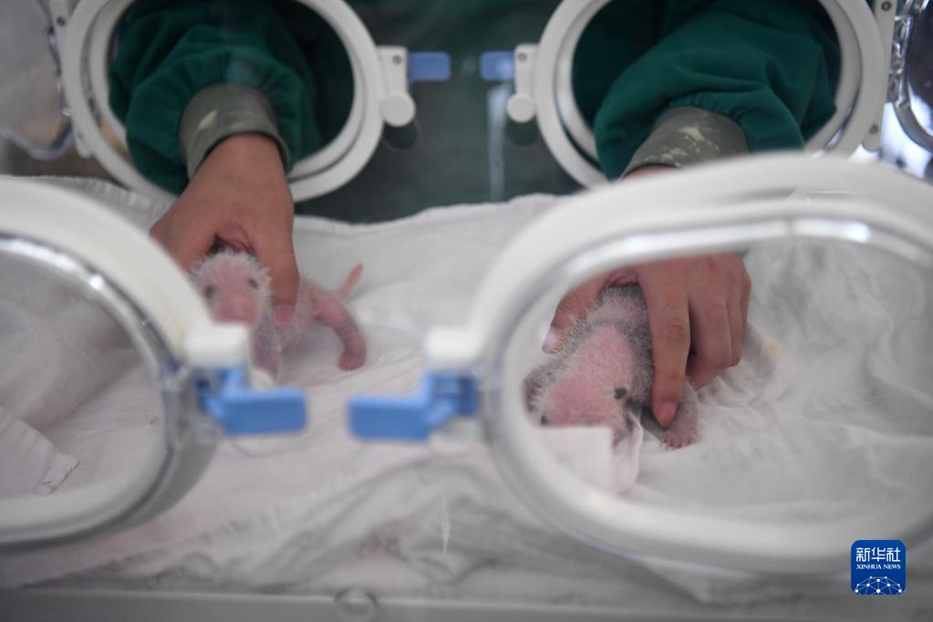 9月23日,重慶動物園工作人員在大熊貓館育幼室內(nèi)照顧雙胞胎幼仔。