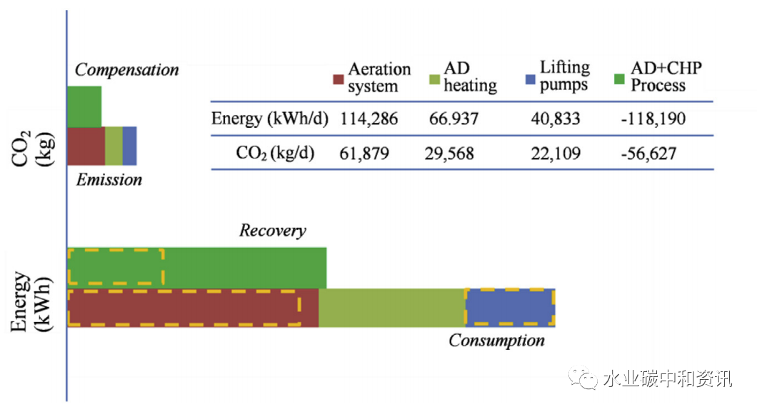 另一方面,污水中余溫熱能可以通過水源熱泵轉(zhuǎn)化出熱量,以平衡能量赤字,甚至達到碳中和。一項關(guān)于污水處理廠(普遍COD = 200 ~ 400 mg/L)能量平衡評估表明,中國剩余污泥厭氧消化產(chǎn)甲烷只能彌補約50%的運行能量消耗(Hao et al.)。進一步研究表明,水源熱泵能夠有效轉(zhuǎn)化污水熱能,用以加熱污水處理廠及其周邊建筑,可提供約0.20 kWh·m-3·℃-1 凈電當量。總的來說,中國有機物及熱能能夠有效供給充足的電當量,足以達到碳中和運行目標。污水處理廠能耗及碳排放情況