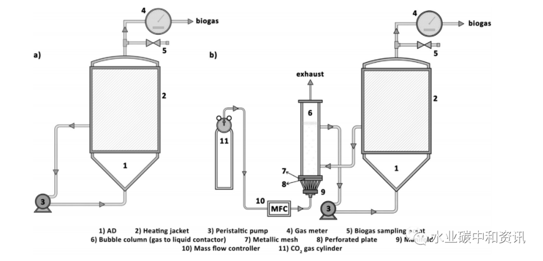 如上所述,剩余污泥與外源固體/液體有機物共消化是實現(xiàn)碳中和的一種潛在途徑。而在厭氧消化中投加CO2也能刺激甲烷產(chǎn)生。一項小試研究證明,向厭氧消化池中投加濃縮有機廢物,適當?shù)靥岣哂袡C負荷及縮短的停留時間,可以提高甲烷產(chǎn)量。因此,市政污水處理廠中可有效應(yīng)用熱電聯(lián)產(chǎn),以大大節(jié)省成本(Tandukar and Pavlostathis)。選擇口香糖制造廠和脫水脂肪油脂液產(chǎn)生的工業(yè)廢液作為外部有機物,與剩余污泥(初級﹕二級=40﹕60TS質(zhì)量比)共消化。結(jié)果顯示,沼氣產(chǎn)量明顯增加,剩余污泥額外降解1.1~30.7%。沼氣和甲烷產(chǎn)量都非常接近能夠彌補能量赤字之目標水平。此外,共消化出水水質(zhì)與只投加剩余污泥控制組相近,說明共消化沒有負面影響。其它有機物與剩余污泥共消化機制相同。一項小試究以牛糞(MN)與外部有機廢物(食品廢物—FW、堿性水解液—AH和粗制甘油—GY)共消化與牛糞單獨消化對比(Usack and Angenent; Regueiro et al.);運行900 d后,4組中溫平行共消化反應(yīng)器顯示出比甲烷產(chǎn)量(SMY)信息,與GY共消化最適宜總有機負荷率(OLR)為3.2 gVS/L·d(MN : GY = 62:38),最佳SMY為549±25 ml CH4/gVS;FW與AH共消化SMY數(shù)值相近(約300 ml CH4/gVS,對應(yīng)OLD =3.9 gVS/L·d,MN:FW = 51:49及OLD = 2.7 gVS/L·d,MN:AH=75:25)。眾所周知,CO2是在消化過程中伴隨著甲烷產(chǎn)生的產(chǎn)物。而另一方面,利用厭氧消化進行CO2捕集固定是一種潛力十足的碳減排策略。兩個處理食品垃圾的厭氧消化試驗進行了225 d監(jiān)測,實驗組定期使用氣泡柱充入CO2(Fernandez et al.)。實驗組測試CH4產(chǎn)率為0.56±0.13 m3 CH4/kgVS·d(對照組為0.45±0.05 )沼氣中CH4濃度為68%,額外攝取了外源CO2 0.55 kg,H2濃度增加了2.5 倍,這歸因于CO2溶解以及酸化與產(chǎn)氫途徑改變。