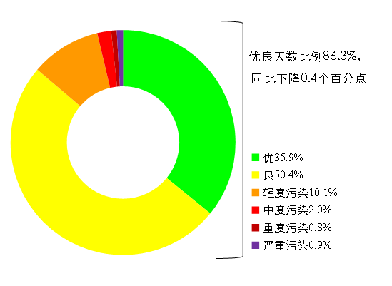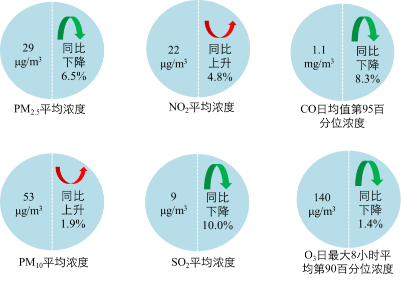 1-8月,全國339個(gè)地級(jí)及以上城市平均優(yōu)良天數(shù)比例為86.3%,同比下降0.4個(gè)百分點(diǎn);PM2.5平均濃度為29微克/立方米,同比下降6.5%;PM10平均濃度為53微克/立方米,同比上升1.9%;O3平均濃度為140微克/立方米,同比下降1.4%;SO2平均濃度為9微克/立方米,同比下降10.0%;NO2平均濃度為22微克/立方米,同比上升4.8%;CO平均濃度為1.1毫克/立方米,同比下降8.3%。