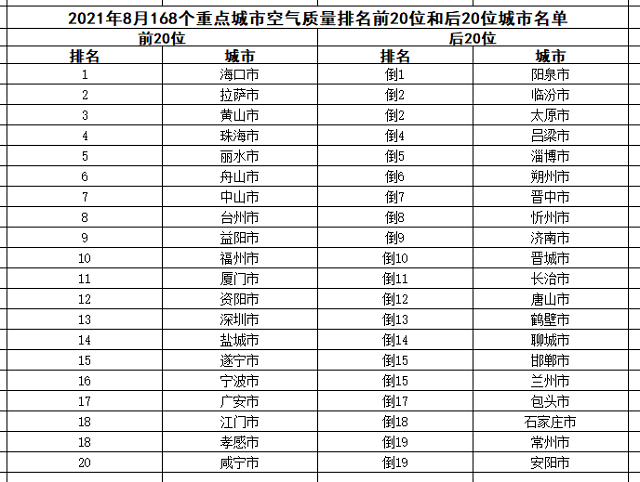 8月,168個(gè)重點(diǎn)城市中,???、拉薩和黃山市等20個(gè)城市空氣質(zhì)量相對(duì)較好(從第1名至第20名);陽泉、臨汾和太原市等20個(gè)城市空氣質(zhì)量相對(duì)較差(從倒數(shù)第1名至并列倒數(shù)第19名),見附表3。
