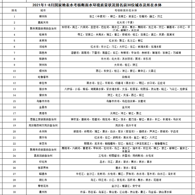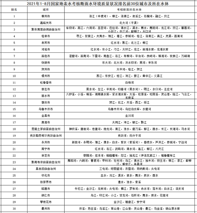 1-8月,全國地級(jí)及以上城市中,柳州、嘉峪關(guān)和黔東南州等30個(gè)城市國家地表水考核斷面水環(huán)境質(zhì)量相對(duì)較好(從第1名至第30名),烏蘭察布、赤峰和呂梁市等30個(gè)城市國家地表水考核斷面水環(huán)境質(zhì)量相對(duì)較差(從倒數(shù)第1名至倒數(shù)第30名)。見附表1和附表2。