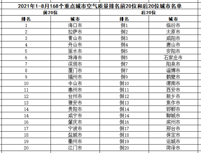 1-8月,168個(gè)重點(diǎn)城市中,海口、拉薩和黃山市等20個(gè)城市空氣質(zhì)量相對(duì)較好(從第1名至第20名);臨汾、太原和咸陽市等20個(gè)城市空氣質(zhì)量相對(duì)較差(從倒數(shù)第1名至倒數(shù)第20名),見附表4。