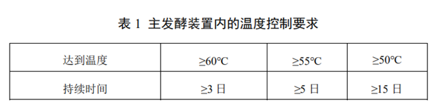c)主發(fā)酵裝置內(nèi)的溫度及持續(xù)時(shí)間應(yīng)滿足表1的要求。采用密閉式堆肥反應(yīng)器時(shí),宜在反應(yīng)器中心與距反應(yīng)器內(nèi)壁100 mm處各設(shè)2個(gè)測溫點(diǎn),溫度按測溫點(diǎn)均值計(jì),溫度需連續(xù)記錄。采用半密閉式和敞開條垛或槽式堆肥時(shí),宜在條垛或槽式堆肥的長度方向每間隔5m橫截面的中心與距表面和底部100 mm處各設(shè)1個(gè)測溫點(diǎn),溫度按測溫點(diǎn)均值計(jì),間隔2小時(shí)記錄溫度1次。