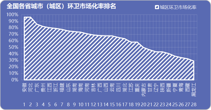 全國(guó)2851個(gè)區(qū)縣(縣級(jí)區(qū)劃)中,城區(qū)環(huán)衛(wèi)市場(chǎng)化推進(jìn)情況不盡相同,呈現(xiàn)出“東高西低”的總特征。如安徽、河北兩省的城區(qū)環(huán)衛(wèi)市場(chǎng)化完成率高達(dá)96%,寧夏、青海、西藏、黑龍江四省的城區(qū)環(huán)衛(wèi)市場(chǎng)化完成率不足40%。