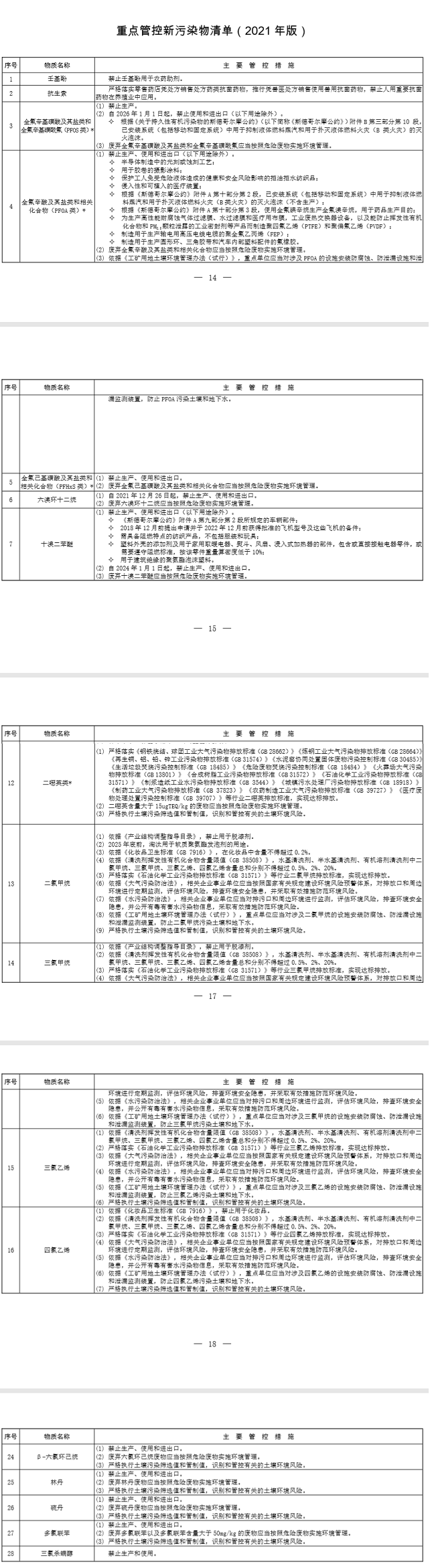 (九)嚴(yán)格實(shí)施淘汰或限用措施。將擬禁止或限制生產(chǎn)、加工使用的化學(xué)物質(zhì)以及相關(guān)工藝、裝備等納入《產(chǎn)業(yè)結(jié)構(gòu)調(diào)整指導(dǎo)目錄》淘汰類或限制類,研究將相關(guān)替代品及替代技術(shù)納入《產(chǎn)業(yè)結(jié)構(gòu)調(diào)整指導(dǎo)目錄》鼓勵(lì)類。對(duì)納入《產(chǎn)業(yè)結(jié)構(gòu)調(diào)整指導(dǎo)目錄》淘汰類或限制類的工業(yè)化學(xué)品、農(nóng)藥、藥品、獸藥、化妝品等,依法停止其產(chǎn)品登記或生產(chǎn)許可證核發(fā)。嚴(yán)格涉新污染物建設(shè)項(xiàng)目準(zhǔn)入,強(qiáng)化環(huán)境影響評(píng)價(jià)管理,不符合禁止生產(chǎn)或限制使用化學(xué)物質(zhì)管理要求的建設(shè)項(xiàng)目,依法不予批準(zhǔn)實(shí)施。將擬禁止進(jìn)出口的化學(xué)品納入《禁止進(jìn)(出)口貨物目錄》,加強(qiáng)進(jìn)出口管控;將嚴(yán)格限制用途的化學(xué)品納入《中國(guó)嚴(yán)格限制的有毒化學(xué)品名錄》,強(qiáng)化進(jìn)出口環(huán)境許可管理;采取激勵(lì)政策,引導(dǎo)企業(yè)事業(yè)單位持續(xù)開發(fā)推廣無毒無害、低毒低害原料和產(chǎn)品。自 2021 年 12 月 26 日起,禁止六溴環(huán)十二烷的生產(chǎn)、加工使用和進(jìn)出口;到 2022 年底,禁止銷售含塑料微珠的日化產(chǎn)品。2025 年底前,逐步禁止 PFHxS 類、十溴二苯醚、短鏈氯化石蠟、五氯苯酚及其鹽類和酯類、六氯丁二烯、得克隆的生產(chǎn)、加工使用和進(jìn)出口;嚴(yán)格限制 PFOS 類、PFOA 類的生產(chǎn)和加工使用;禁止壬基酚用于農(nóng)藥助劑;基本實(shí)現(xiàn)二噁英類全面達(dá)標(biāo)排放。