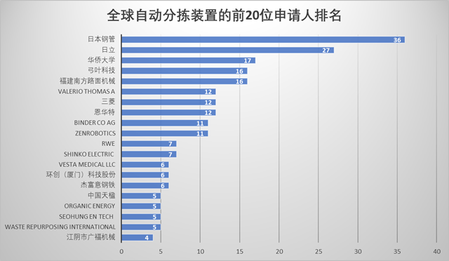 圖2:全球垃圾分揀裝置收集技術(shù)前20名申請(qǐng)人排名