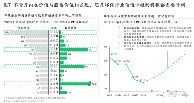 但必須承認(rèn)的是,向好趨勢(shì)的背后,我國資本市場(chǎng)的制度完善仍需時(shí)間。首先是生態(tài)環(huán)保企業(yè)內(nèi)在價(jià)值與股票價(jià)值的相匹配需要時(shí)間,在對(duì)生態(tài)環(huán)保企業(yè)2020年?duì)I收前15強(qiáng)的營收、ROIC加權(quán)和PE倍數(shù)進(jìn)行分析得到,多數(shù)企業(yè)(如企業(yè)A、E、I、M)的內(nèi)在價(jià)值與股票價(jià)值在資本市場(chǎng)上并不匹配。其次是生態(tài)環(huán)保估值中樞的提升仍需時(shí)日,盡管隨著國家政策的提振、生態(tài)環(huán)保行業(yè)的發(fā)展、部分細(xì)分行業(yè)企業(yè)現(xiàn)金流狀況的改善,環(huán)保估值中樞提升未來可期,但也并不是一蹴而就的(見圖7)。