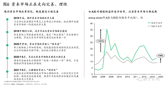 政策推動(dòng)下,國內(nèi)資本市場(chǎng)改革逐步深化,制度建設(shè)日趨完善,生態(tài)環(huán)保企業(yè)面臨的資本市場(chǎng)大環(huán)境正走向理性。A股對(duì)H股的溢價(jià)逐步收窄便是其中一佐證:基于對(duì)95家同時(shí)在A股和港股上市的企業(yè)的分析,可以看到相比于2006年最高峰時(shí)A股對(duì)H股超過100%的溢價(jià),當(dāng)前30%-40%的溢價(jià)已有明顯收窄(見圖6)。