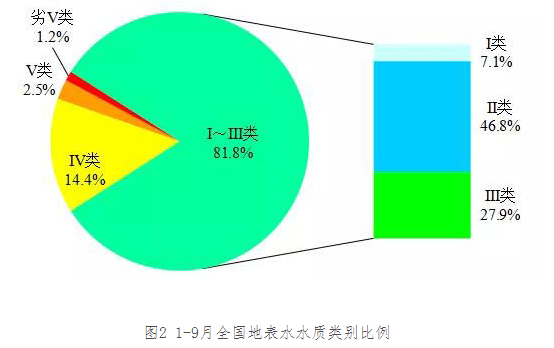 1-9月,3641個(gè)國(guó)家地表水考核斷面中,水質(zhì)優(yōu)良(Ⅰ~Ⅲ類(lèi))斷面比例為81.8%,同比上升1.2個(gè)百分點(diǎn);劣Ⅴ類(lèi)斷面比例為1.2%,同比下降0.9個(gè)百分點(diǎn)。主要污染指標(biāo)為化學(xué)需氧量、高錳酸鹽指數(shù)和總磷。