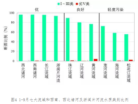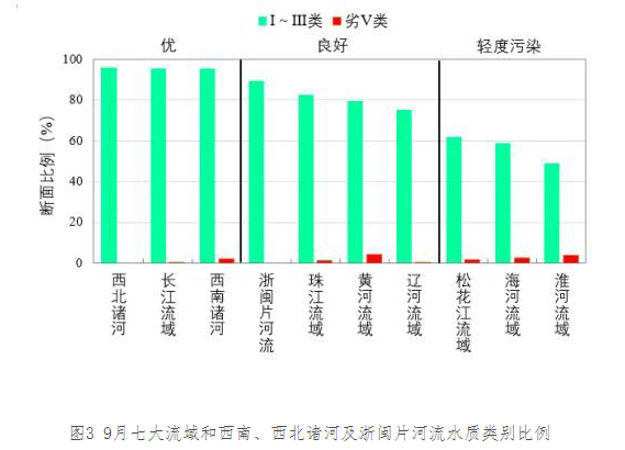 9月,長(zhǎng)江、黃河、珠江、松花江、淮河、海河、遼河等七大流域及西北諸河、西南諸河和浙閩片河流水質(zhì)優(yōu)良(Ⅰ~Ⅲ類(lèi))斷面比例為80.3%,同比上升1.7個(gè)百分點(diǎn);劣Ⅴ類(lèi)斷面比例為1.5%,同比下降1.0個(gè)百分點(diǎn)。主要污染指標(biāo)為高錳酸鹽指數(shù)、化學(xué)需氧量和總磷。其中,西北諸河、長(zhǎng)江流域和西南諸河水質(zhì)為優(yōu);浙閩片河流、珠江、黃河和遼河流域水質(zhì)良好;松花江、海河和淮河流域?yàn)檩p度污染。