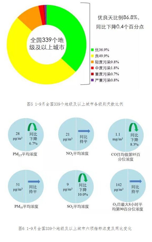 1-9月,全國(guó)339個(gè)地級(jí)及以上城市平均優(yōu)良天數(shù)比例為86.8%,同比下降0.4個(gè)百分點(diǎn);PM2.5平均濃度為28微克/立方米,同比下降6.7%;PM10平均濃度為51微克/立方米,同比持平;O3平均濃度為142微克/立方米,同比持平;SO2平均濃度為9微克/立方米,同比下降10.0%;NO2平均濃度為21微克/立方米,同比持平;CO平均濃度為1.1毫克/立方米,同比下降8.3%。