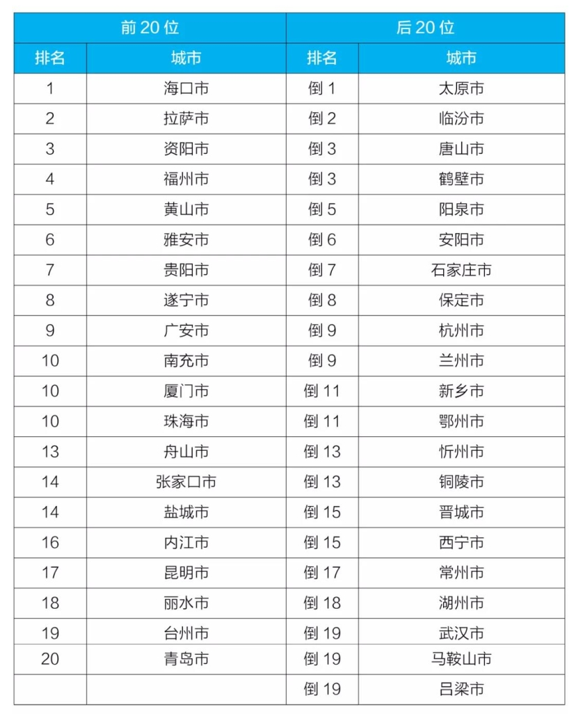 9月,168個(gè)重點(diǎn)城市中,海口、拉薩和資陽(yáng)市等20個(gè)城市空氣質(zhì)量相對(duì)較好(從第1名至第20名);太原、臨汾和唐山市等20個(gè)城市空氣質(zhì)量相對(duì)較差(從倒數(shù)第1名至并列倒數(shù)第19名),見(jiàn)附表5。