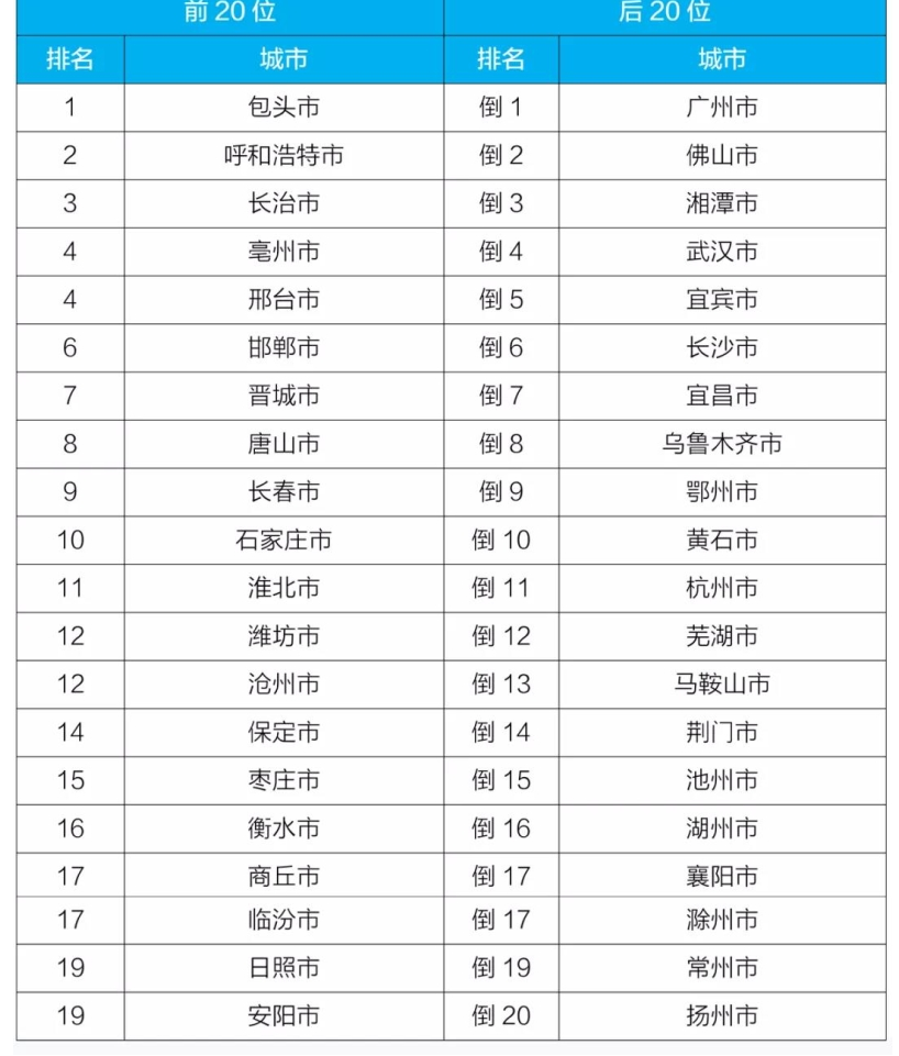 1-9月,168個(gè)重點(diǎn)城市中,拉薩、??诤忘S山市等20個(gè)城市空氣質(zhì)量相對(duì)較好(從第1名至第20名);臨汾、太原和唐山市等20個(gè)城市空氣質(zhì)量相對(duì)較差(從倒數(shù)第1名至倒數(shù)第20名),見(jiàn)附表6。包頭、呼和浩特、長(zhǎng)治市等城市空氣質(zhì)量變化情況相對(duì)較好(從第1名至并列第19名);廣州、佛山、湘潭市等城市空氣質(zhì)量變化情況相對(duì)較差(從倒數(shù)第1名至倒數(shù)第20名),見(jiàn)附表7。