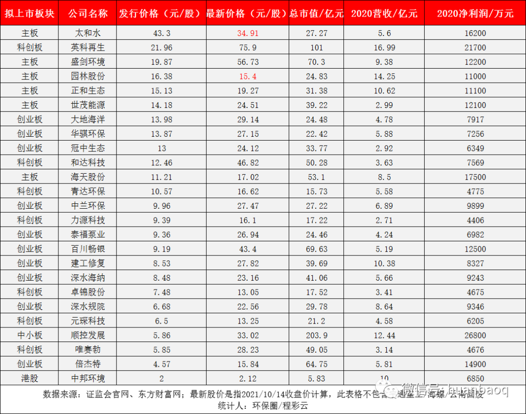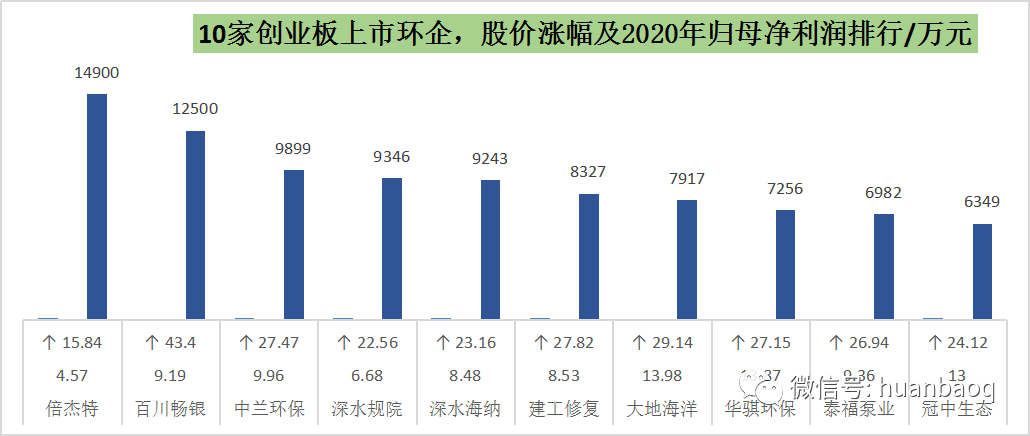 接下來,再說說大家比較關(guān)心的,今年上市企業(yè)的股價(jià)漲幅、最新市值和盈利水平。我們選擇主板、創(chuàng)業(yè)板、科創(chuàng)板上市的企業(yè)分別進(jìn)行對(duì)比。今年在主板上市的共有7家企業(yè),分別為太和水、園林股份、海天股份、盛劍環(huán)境、世茂能源、正和生態(tài)和宇通重工,由于宇通重工是通過大股東摘帽變更方式上市而來,暫且不對(duì)其進(jìn)行評(píng)價(jià)。剩下6家企業(yè)中,根據(jù)10月14日的收盤價(jià),太和水和園林股份竟然跌破發(fā)行價(jià),尤其是太和水,從發(fā)行價(jià)的43.3元/股跌至34.91元/股,總市值蒸發(fā)了近14億元。而同為主板上市的盛劍環(huán)境則表現(xiàn)極佳,這家從事半導(dǎo)體廢氣治理、煙氣凈化的公司,在國(guó)內(nèi)半導(dǎo)體產(chǎn)業(yè)大發(fā)展背景下,股價(jià)從19.87元/股漲至56.73元/股,總市值升至70.3億元,成為今年主板上市市值最高環(huán)保企業(yè)。這6家主板上市環(huán)企,2020實(shí)現(xiàn)營(yíng)業(yè)收入大多位于5億元-14億元之間,歸母凈利潤(rùn)也大多在1億元-2億元,營(yíng)收最高的是杭州園林股份的14.25億元,凈利最高的則是成都海天股份的1.75億元。自上市以來,海天股份動(dòng)作頻頻,半年前還收購(gòu)了新開元等4座污水廠,然后又?jǐn)M與康恒合資開公司,開拓四川垃圾焚燒/固廢業(yè)務(wù)。▼圖七:6家主板上市環(huán)企,2020年?duì)I收與凈利潤(rùn)相對(duì)于主板上市企業(yè)的表現(xiàn)平平,今年10家在創(chuàng)業(yè)板上市的環(huán)企,股價(jià)清一色迎來大增,從8元-9元小盤股漲至20元-40元的中小型股,大多翻了2倍,或許跟創(chuàng)業(yè)板估值起飛有關(guān)。其中,百川暢銀(垃圾填埋氣發(fā)電)和倍杰特(高鹽度工業(yè)廢水治理)值得一說,不是由于股價(jià)翻了幾翻,而是在于它們卓越的賺錢能力。相較于其他上市環(huán)企的幾千萬凈利,去年在飽受疫情沖擊的情況下,這兩家企業(yè)的凈利潤(rùn)竟然都過了億,比老牌上市企業(yè)盈利能力還要強(qiáng)。▼圖八:10家創(chuàng)業(yè)板上市環(huán)企,2020年凈利潤(rùn)排行接著,我們?cè)倏纯苿?chuàng)板,相對(duì)于去年的11家,今年科創(chuàng)板上市的環(huán)企只有7家,分別是英科再生、和達(dá)科技、青達(dá)環(huán)保、力源科技、卓錦股份、元琛科技、唯賽勃。這7家企業(yè),除了英科再生(塑料回收再生)2020年歸母凈利潤(rùn)遙遙領(lǐng)先之外,其余幾家凈利潤(rùn)都在幾千萬左右。值得一提的是膜企唯賽勃,去年?duì)I收和凈利潤(rùn)雙雙下滑,其中凈利潤(rùn)下滑30%至4674萬元,這也從側(cè)面說明了科創(chuàng)板企業(yè)過會(huì)門檻相對(duì)較低。▼圖九:7家科創(chuàng)板上市環(huán)企,2020年凈利潤(rùn)排行