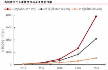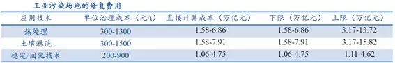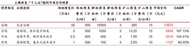 土壤修復十三五市場空間1100億-5900億,遠期市場總量在7.4萬億元左右。在中性情景下,十三五市場空間總量約3400億。