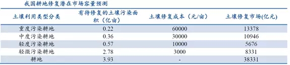 我國土壤污染類型包括農業(yè)耕地土壤污染、城市工業(yè)用地土壤污染以及礦區(qū)土壤污染。目前,我國待修復的污染場地數量非常之多,保守估計超過50萬塊。其中,耕地土壤修復投資需求在3萬億以上,城市土壤修復投資需求1萬億以上,礦區(qū)土壤修復投資需求可達近2萬億。(備注:由于修復分為輕重緩急,分階段進行,而且受到資金的制約,所以預測的投資需求,和真正會去修復的地塊,不是同一個概念)
