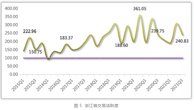 2021年浙江省排污權(quán)交易活躍度保持震蕩前行總基調(diào),第三季度浙江省排污權(quán)交易活躍度周期性下行,收報于240.83點,環(huán)比下降22.09%,同比微漲0.45%,基本保持2020年同期水平。