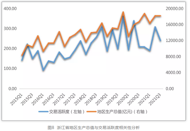浙江省排污權(quán)交易活躍度與地區(qū)生產(chǎn)總值(采用浙江省地區(qū)生產(chǎn)總值各季度增加值,非累計)整體呈中度正相關(guān)走勢,顯著性水平小于0.01,皮爾遜相關(guān)系數(shù)為0.750。