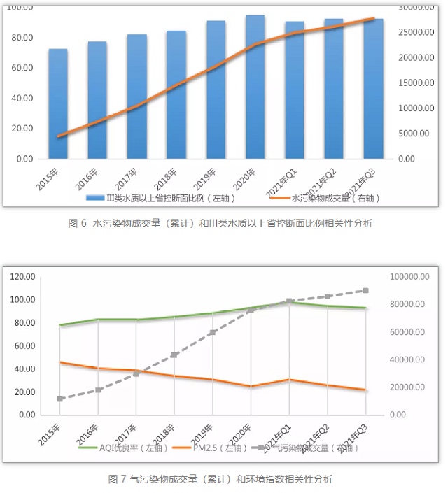 從環(huán)境改善情況來看,水污染物成交量(由化學需氧量和氨氮成交量構(gòu)成)與III類水質(zhì)以上省控斷面比例呈高度正相關(guān)關(guān)系,顯著性水平小于0.01,皮爾遜相關(guān)系數(shù)為0.940。氣污染物成交量(由二氧化硫和氮氧化物成交量構(gòu)成)與浙江省AQI優(yōu)良率呈高度正相關(guān)關(guān)系,顯著性水平小于0.01,皮爾遜相關(guān)系數(shù)為0.958;氣污染物成交量與PM2.5指數(shù)呈高度負相關(guān)關(guān)系,顯著性水平小于0.01,皮爾遜相關(guān)系數(shù)為-0.950。