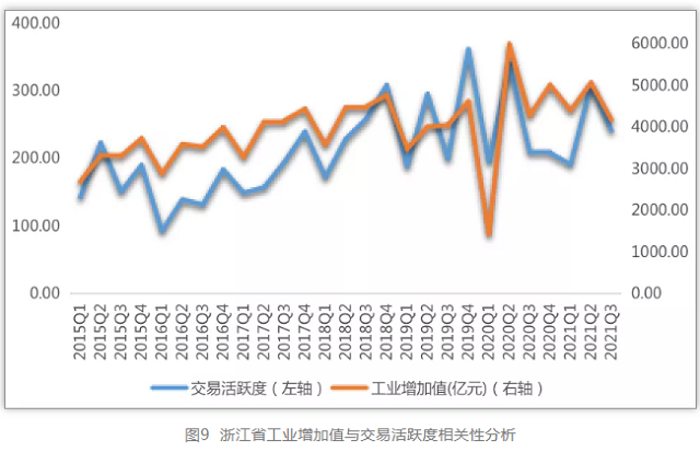 從工業(yè)經(jīng)濟指標來看,浙江省排污權(quán)交易活躍度與工業(yè)增加值(采用浙江省地區(qū)工業(yè)增加值各季度增加值,非累計)整體也呈中度正相關(guān)走勢,顯著性水平小于0.05,皮爾遜相關(guān)系數(shù)為0.661。