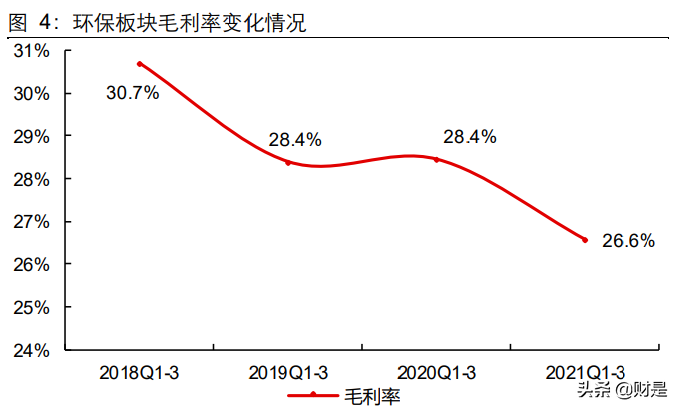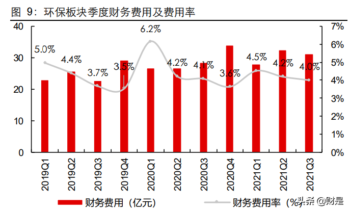 費用端得到控制:2021Q1-Q3環(huán)保板塊期間費用累計支出為361.8億元,同比增14.6%, 期間費用率同比降1.2pct至15.7%。費用率方面,銷售費用率 2.8%,同比降0.41pct;管理費用(含研發(fā)費用,下同)率8.8%,同比降 0.37pct;財務費用率4.1%,同比降0.41pct。期間費用率同比下行的主要原因是:疫情后,收入同比大幅增長23.3%,致期間費用率顯著下行。