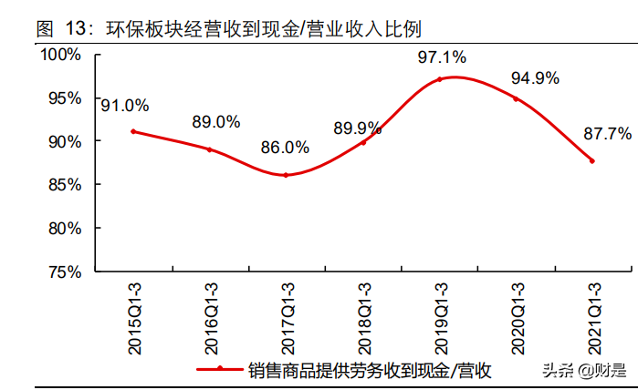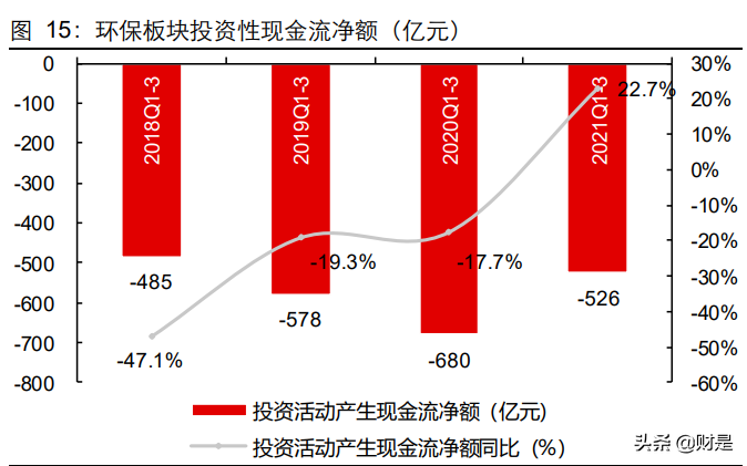 2021Q1-Q3 環(huán)保板塊銷售商品收到現(xiàn)金/營收比率(收現(xiàn)比)為 87.7%,同比降 7.2pct,處于歷史數(shù)據(jù)區(qū)間內(nèi);經(jīng)營活動、投資活動及籌資活動產(chǎn)生的現(xiàn)金流量凈額分別 151 億 元(去年同期為 206 億元,同比降 27%)、-526 億元(去年同期為-680億元,凈支出同 比減少 23%)和 197 億元(去年同期為 540 億元,同比降 64%)。