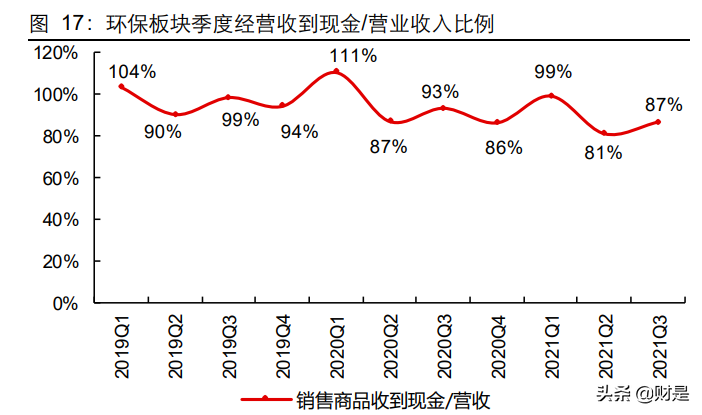 大氣、水務運營、節(jié)能板塊收現(xiàn)比降幅顯著,大氣、節(jié)能主要為工程或設備銷售類業(yè)務,在行業(yè)內(nèi)回款相對較差;水務運營主要是收入快速上行,存在較短的回款周 期滯后,且很可能與中原環(huán)保、洪城環(huán)境等工程類業(yè)務增加有關。三者收現(xiàn)比分別同比降 13.8pct/11.8pct/11.4pct,與其收入分別同比增 17.1%/29.7%/19.0%有關。