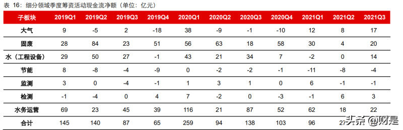 2021Q1-Q3環(huán)保板塊籌資活動現(xiàn)金流凈額為197億元,同比降 64%,行業(yè)融資帶有階段性,2020 年同期籌資活動現(xiàn)金流凈額為 540 億元,同比增 163 億元,故推測為2021年籌資活動相對較弱的主要原因。而水(工程設備)方向的融資規(guī)模持續(xù)受控,同比減少90億元。