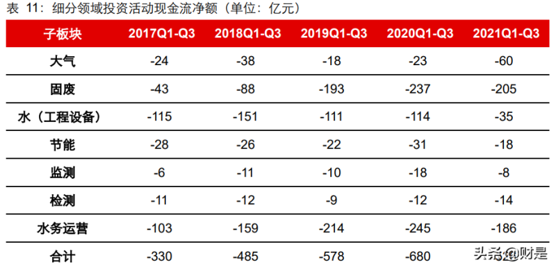 2021Q1-Q3 環(huán)保經(jīng)營活動現(xiàn)金流凈額為 151 億元,同比降 27%,主要因水務運營下降較多,水(工程設備)、監(jiān)測為凈流出。