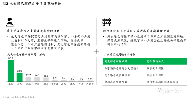 在危廢產(chǎn)量高的省份,頭部企業(yè)更是具有絕對優(yōu)勢,例如光大綠色環(huán)保,一方面重點(diǎn)關(guān)注危廢產(chǎn)生量高度集中的區(qū)域,早早布局江蘇、山東兩個產(chǎn)廢大省和貯存大省,將其60%的產(chǎn)能都布局于此,兩省累計布局超過110萬噸的產(chǎn)能,以此為基礎(chǔ),在江蘇、山東產(chǎn)能逐漸過剩時,其最新的項目開始以江蘇為中心向東南各省擴(kuò)展;另一方面,他們也特別關(guān)注危廢產(chǎn)量高省份在工業(yè)園區(qū)及周邊布局危廢處理設(shè)施,擁有多個危廢項目布局在工業(yè)園區(qū)及周邊,保障危廢來源,避免了中小產(chǎn)廢企業(yè)遷移或關(guān)停造成拿料困難的情況(見圖2)。