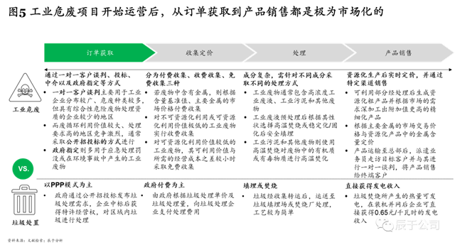 值得注意的是,工業(yè)危廢運(yùn)營階段的競爭同樣十分激烈,從來料獲取到產(chǎn)品銷售都極為市場化(見圖5)。以訂單獲取為例,工業(yè)危廢往往需要通過一對一客戶談判、投標(biāo)、中介以及政府指定等方式來展開,這與傳統(tǒng)的垃圾處置行業(yè)以PPP模式為主是截然不同的。