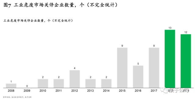 一是與市場需求種類不匹配,根據(jù)2019年最新修訂發(fā)布的《國家危險廢物名錄》,我國危險廢物分類共有46大類,471種,而我國90%以上危廢處置企業(yè)僅能處置5種或以下的危廢種類,供需種類錯配的現(xiàn)象較嚴(yán)重;二是產(chǎn)能落后,處置規(guī)模小,技術(shù)和使用設(shè)備落后,無法滿足污染防治的要求;三是安全隱患突出,環(huán)境管理水平低下以及相關(guān)危險廢物經(jīng)營安全的規(guī)章制度不完善,導(dǎo)致環(huán)境安全隱患問題突出??梢灶A(yù)見的是,隨著市場競爭日益激烈,“小而弱”的工業(yè)危廢企業(yè)將越來越難以適應(yīng)市場新要求,頻頻被“出清”。據(jù)不完全統(tǒng)計,2010-2014年,每年關(guān)停的工業(yè)危廢服務(wù)企業(yè)僅為2——4家,2018和2019年則分別達(dá)到了13和12家(見圖7)。