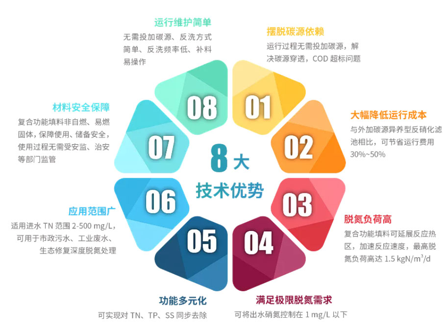 而通過對(duì)復(fù)合活性生物載體中硫、鐵及其他活性組分進(jìn)行優(yōu)化設(shè)計(jì),則能促使附著其上的功能微生物形成代謝偶聯(lián)網(wǎng)絡(luò),實(shí)現(xiàn)高生物持有量、長(zhǎng)距離電子傳遞,進(jìn)而獲得高負(fù)荷脫氮能力,徹底擺脫對(duì)碳的依賴。▼SADeN®技術(shù)8大核心優(yōu)勢(shì)
