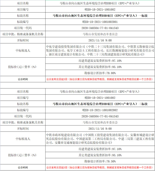 2021年11月17日,馬鞍山市公告資源交易中心發(fā)布《馬鞍山市向山地區(qū)生態(tài)環(huán)境綜合治理EOD項目(EPC+產(chǎn)業(yè)導(dǎo)入)項目中標(biāo)公示》。