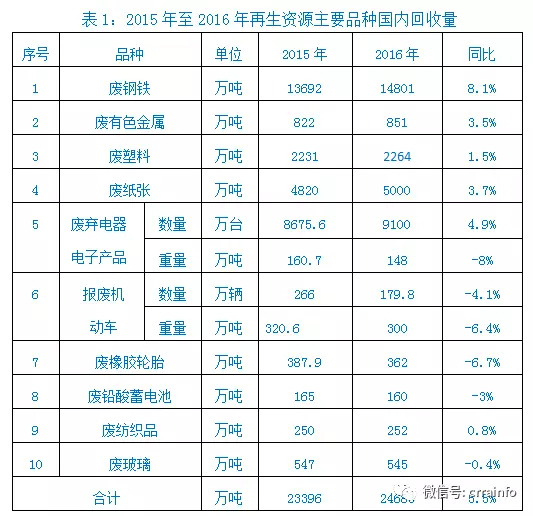1、回收量。在宏觀經(jīng)濟形勢總體下行的背景下,再生資源回收行業(yè)總體規(guī)模不但沒有出現(xiàn)大幅下滑,而且有了一定幅度的增長。據(jù)中再生協(xié)會統(tǒng)計顯示,2016年,廢鋼、廢有色金屬、廢塑料、廢紙、廢棄電器電子產(chǎn)品、報廢汽車、廢橡膠輪胎、廢鉛酸蓄電池、廢紡織品、廢玻璃等10個主要品種國內(nèi)回收量2.47億噸(見表1),比2015年同比增長5.5%。