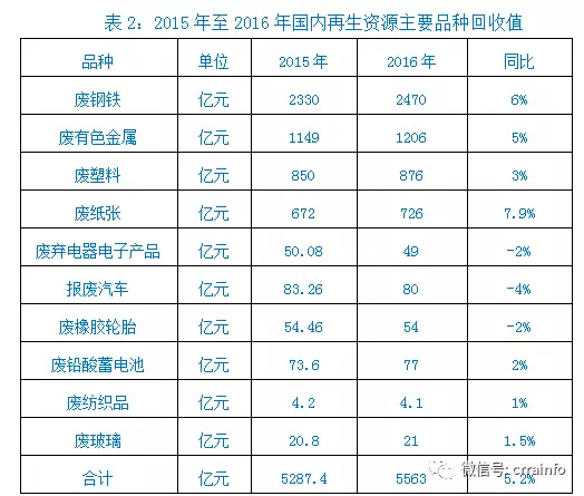 2、回收值。2016年,廢鋼、廢有色金屬、廢塑料、廢紙、廢棄電器電子產(chǎn)品、報廢汽車、廢橡膠輪胎、廢鉛酸蓄電池等10個主要品種國內(nèi)回收值5563億元(見表2),比2015年同比增長5.2%,扭轉(zhuǎn)了近幾年回收值連續(xù)大幅下滑的趨勢,實現(xiàn)了一定增長,提示著再生資源行業(yè)開始進入初春。