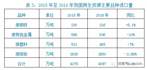 3、進口量。2016年,我國廢鋼鐵、廢有色金屬、廢塑料、廢紙4個品種的進口量達4087萬噸,比2015年同比下降4.4%(見表3)。進口量同比下降的原因,是環(huán)保監(jiān)管趨嚴,國家收緊固廢進口政策。