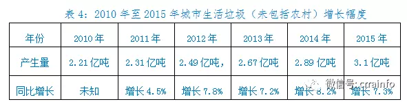 4、近五年全國城市生活垃圾增長幅度。中再生協(xié)會專家組通過實地調(diào)研及查閱相關(guān)部門資料發(fā)現(xiàn),2010年,全國城市生活垃圾產(chǎn)生量2.21億噸,到2015年,全國城市生活垃圾產(chǎn)生量增長到3.1億噸,5年間城市生活垃圾平均年增長7.54%,其中2014年比2013年同比增長8.2%(見表4)。