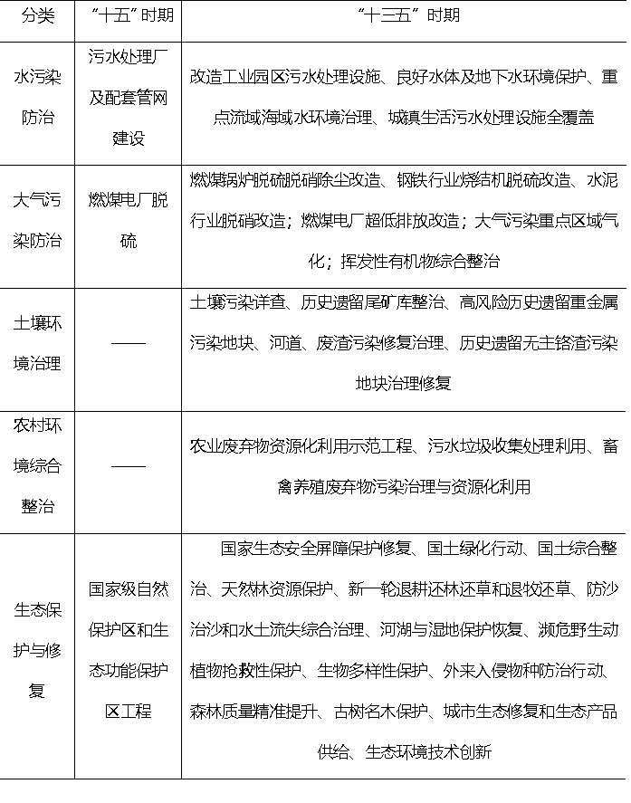 根據(jù)國務(wù)院《關(guān)于國家環(huán)境保護“十五”計劃的批復》(國函〔2001〕169號)和《關(guān)于印發(fā)“十三五”生態(tài)環(huán)境保護規(guī)劃的通知》(國發(fā)〔2016〕65 號),本文基于五大領(lǐng)域分別梳理兩個文件所列重點工程。從水污染防治、大氣污染防治、生態(tài)保護與修復三大領(lǐng)域看,“十三五”時期較“十五”時期工程任務(wù)更重,細分領(lǐng)域更多。從土壤環(huán)境治理和農(nóng)村環(huán)境綜合整治兩大領(lǐng)域看,“十五”時期尚未涉及,“十三五”時期該工程已具有較多建設(shè)內(nèi)容(表1)。類似“雙碳”目標和新污染物,伴隨中國經(jīng)濟社會發(fā)展,待控污染物種類在增加,污染排放標準在提高,環(huán)保新領(lǐng)域不斷出現(xiàn),在很長時間內(nèi),環(huán)保重點工程細分領(lǐng)域?qū)⒊试黾于厔?,環(huán)保投資構(gòu)成將愈發(fā)豐富。