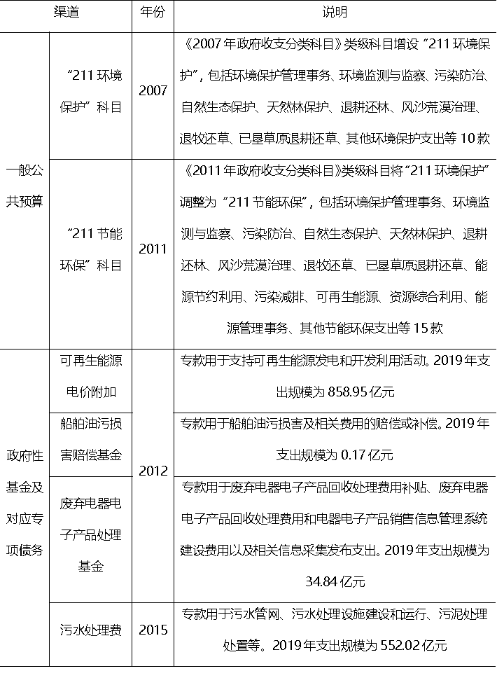 1979年制定的環(huán)?!叭瑫r”制度能夠保障新改擴建項目環(huán)保投資,是排污企業(yè)落實污染者付費責任的重要渠道。財政環(huán)保支出渠道拓展主要體現(xiàn)在兩大渠道:第一個渠道是一般公共預(yù)算,2007年新設(shè)“211環(huán)境保護”科目,2011年將其調(diào)整為“211節(jié)能環(huán)保”科目,科目單設(shè)表明政府對環(huán)境保護工作高度重視,相關(guān)支出會隨之增加。第二個渠道是政府性基金及對應(yīng)專項債務(wù),與環(huán)境保護直接相關(guān)的有四項。其中,可再生能源電價附加、船舶油污損害賠償基金以及廢棄電器電子產(chǎn)品處理基金于2012年納入政府性基金管理,污水處理費于2015年納入政府性基金管理(表2)。政府性基金專款專用,為相關(guān)領(lǐng)域財政環(huán)保支出提供穩(wěn)定渠道。