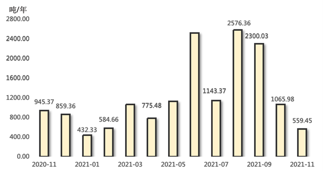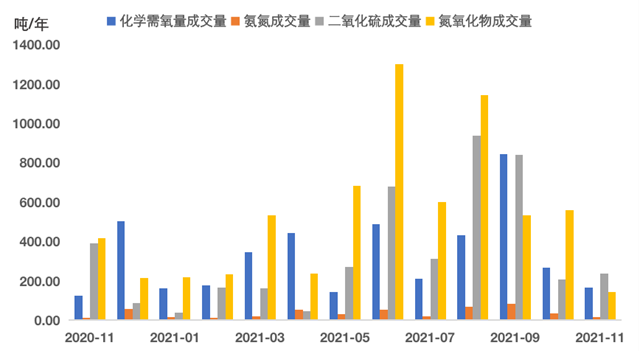 排污權(quán)成交量持續(xù)收窄,指標(biāo)延續(xù)下行走勢。2021年11月,四項(xiàng)排污權(quán)成交量合計(jì)為559.45噸,環(huán)比下跌47.52%,與上年同期相比下降40.82%。