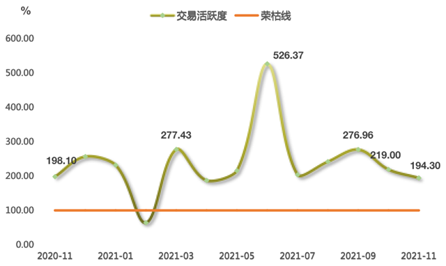 浙江省排污權(quán)交易活躍度盤整下降,降幅收窄。由圖可見,交易活躍度指數(shù)延續(xù)上月兩月下行走勢后,2021年11月指數(shù)值收報(bào)于194.30點(diǎn),環(huán)比下降11.28%,與上年同期相比微跌1.92%。