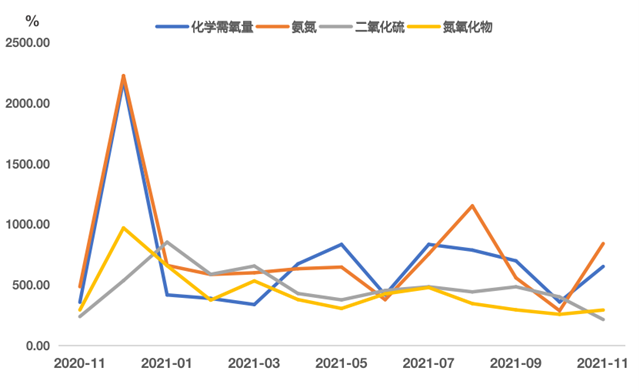 從四項(xiàng)排污權(quán)交易環(huán)比情況來看,呈現(xiàn)“三漲一跌”走勢。其中,氨氮、化學(xué)需氧量、氮氧化物環(huán)比分別上漲193.69%、81.78%和13.86%,二氧化硫環(huán)比下跌46.67%;與上年同期相比情況來看,化學(xué)需氧量、氨氮同比上行82.95%、73.38%|,二氧化硫、氮氧化物同比下行10.30%、0.25%。