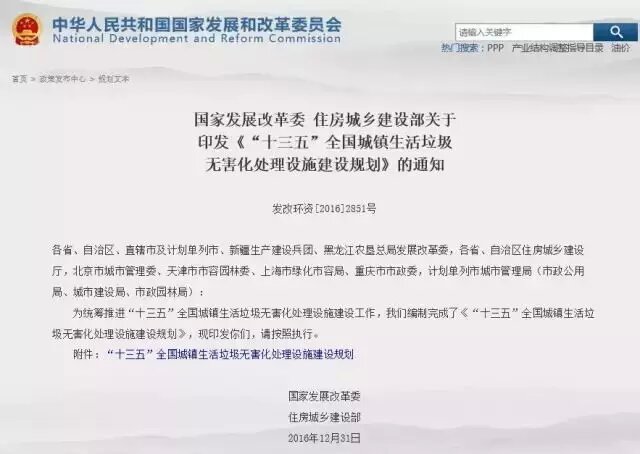 國家發(fā)改委 住建部關(guān)于印發(fā)《“十三五”全國城鎮(zhèn)生活垃圾無害化處理設(shè)施建設(shè)規(guī)劃》的通知