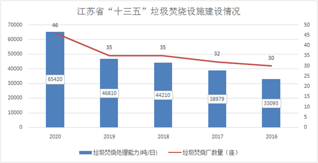 以江蘇省“十三五”垃圾焚燒建設(shè)為例,“十三五”時(shí)期,江蘇省城市生活垃圾處理設(shè)施較“十二五”新增15座,日處理能力翻了一倍,特別是2018年后,增幅明顯,這與《江蘇省環(huán)境基礎(chǔ)設(shè)施三年建設(shè)方案(2018——2020年)》印發(fā),組織實(shí)施一系列重點(diǎn)工程有關(guān)。按照《江蘇省“十四五”生態(tài)環(huán)境保護(hù)規(guī)劃》,“十四五”全省無(wú)害化能力僅計(jì)劃新增2萬(wàn)噸/日,餐廚廢棄物處理能力計(jì)劃新增2000噸/日。