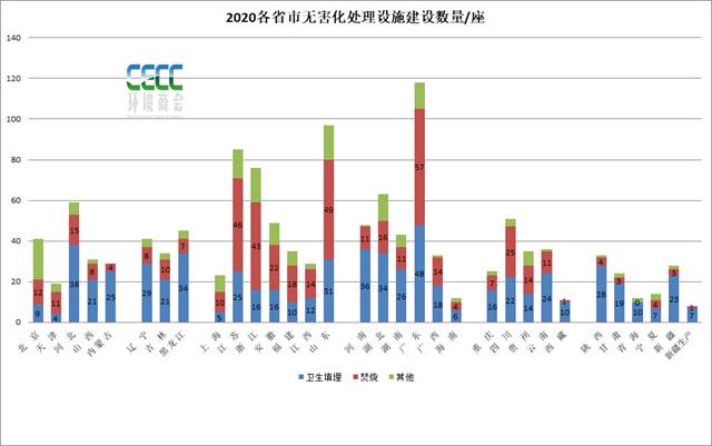 截至2020年,廣東、山東、江蘇、浙江四個(gè)省無(wú)害處理設(shè)施建設(shè)數(shù)量領(lǐng)跑,分別為118座、97座、85座和76座,它們建設(shè)的垃圾焚燒處理設(shè)施也最多,分別擁有57座、49座、46座、43座。而衛(wèi)生填埋場(chǎng)相對(duì)較多的省市則是廣東省(48座)、河北省(38座),河南省(36座),湖北省(34座)。按區(qū)域來(lái)看,華北地區(qū)、華中地區(qū)以及西南地區(qū)、東北地區(qū)建設(shè)垃圾填埋場(chǎng)數(shù)量明顯多于華東、華南地區(qū)。