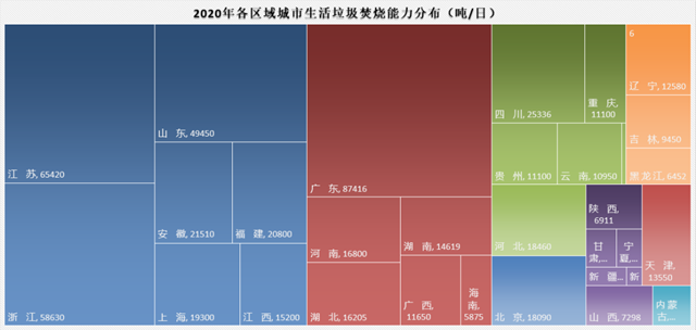 如果從無(wú)害化處理能力來(lái)看,又是另一番景象。廣東、山東、江蘇、浙江四省無(wú)害化處理能力仍然領(lǐng)跑,其中垃圾焚燒處理能力分別達(dá)到87416噸/日、49450噸/日、65420噸/日、58630噸/日。可以看到排序略有變化,江蘇、浙江的垃圾焚燒處理能力高于山東省,推算如果論平均單體垃圾焚燒項(xiàng)目規(guī)模,江蘇和浙江省高于山東省。數(shù)據(jù)中還可以看到,這幾個(gè)省份是大力發(fā)展生活垃圾焚燒的省份,不僅焚燒廠建得多,而且垃圾焚燒日處理能力和處理量也處在突出高位。